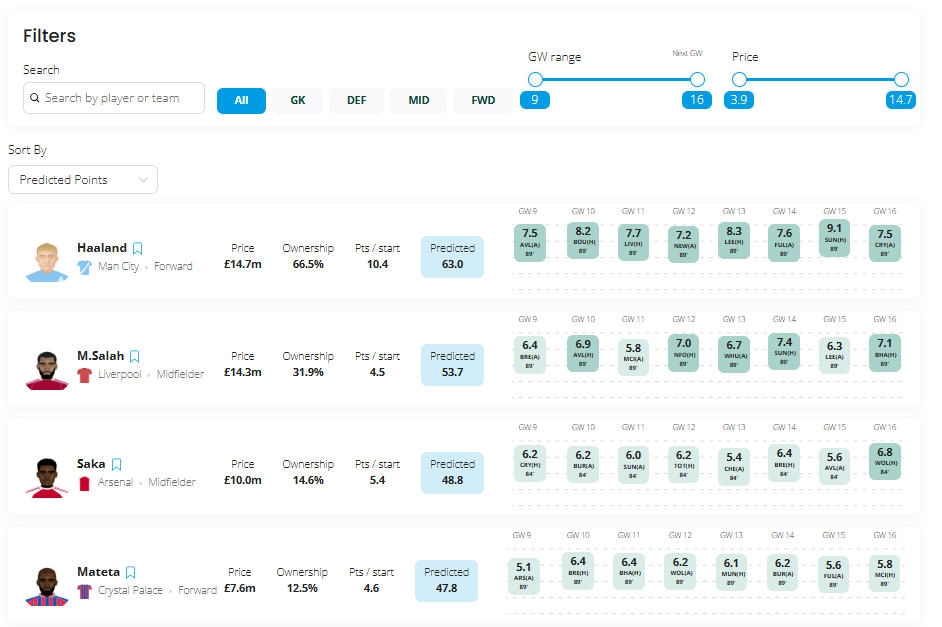 Our Points Predictions Tool gives you a prediction of players points, goals, assists, returns, value, anytime goal, anytime assist, anytime clean sheet or anytime returns.